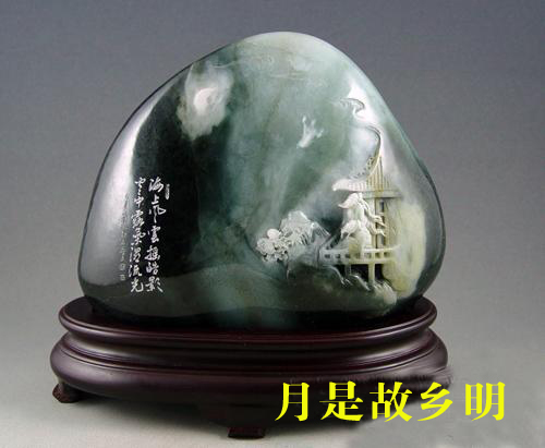 思路和理念定格之后,王志亚大胆地开始了实践创作。针对一块26CM×23CM×5.5CM的黑白青相间的独玉,王志亚研究了足足半个月还没有迟迟动工。玉料去皮后,王志亚眼前一亮,色泽符合水墨山水的色彩搭配,感觉非常的好。大脑深处,一轮弯月隐隐地藏于云涧,稍稍露出的月芽照亮了周边洁白的云彩,远处一望无际的山林显得一片昏暗,一位老人坐在树下的石凳上独自饮酒,另一位老者举头望月若有所思的构思跃然于心。图案设计出来后,有的同事不由说道,这不是“望月”。在雕琢过程中,视角与意境更加浓烈。作品创作出来后,王志亚不断审视作品反复思考,《望月》显得太直白和通俗,《月是故乡明》这一富有诗情画意的名字更能体会出作品宁静、深邃的意境。