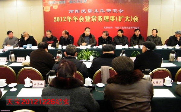 2012年12月26日,在南阳宾馆2号楼三楼会议室,召开了2012年年会。市委宣传部景文栓副部长、南阳民俗文化研究会会长秦俊、著名作家二月河、周同宾、南阳理工学院教授杨世俊以及市民间组保管理局领导、市社科联领导到会,分别做出重要讲话,大家围绕民俗文化是社会文化之根,人文人性之本,经济建设之神以及民俗文化研究的方向和有效途径进行了热烈的讨论,提出了忠恳的意见和建议。