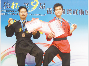 上图:孙浩东(左)、李相如(右)在香港国际武术节领奖台上展示奖牌和证书。