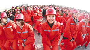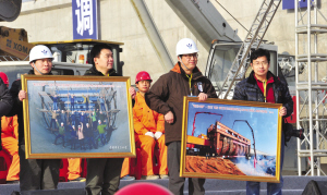 本报记者蒋宁宇(右一)拍摄的图片赠给工程建设者