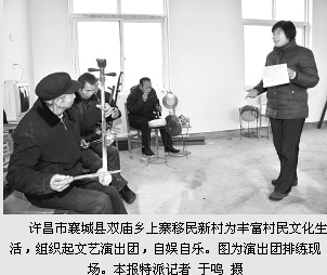 2010年5月22日,移民曲剧团在滔河乡白亭村倾情演出:“现如今移民政策好,你看那移民干部为咱跑前忙后,你看那移民新村就像是别墅群……”白亭是第二批搬迁村,同样安置在襄城。