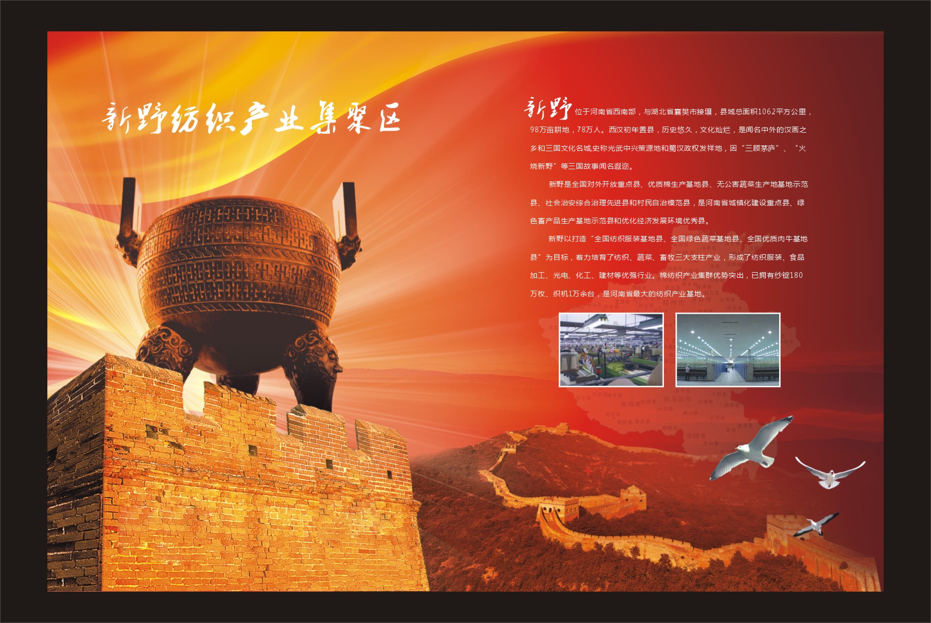 一是产业特色鲜明。我们坚持“三规合一、四集一转、产城一体”的发展要求,围绕棉纺织、畜牧、蔬菜特色产业和光电新兴产业,规划建设了县产业集聚区、肉牛产业集群示范区和蔬菜产业园区。县产业集聚区以白河为轴线,以县城为依托,总规划面积13平方公里,分为纺织服装产业园和光电电子信息产业园两个特色产业园区,形成了“一体两翼”的发展格局。西区纺织服装产业园规划面积9.4平方公里,以纺织服装产业为主导;东区光电电子信息产业园规划面积3.6平方公里,以光电电子产业为主导。目前,集聚区建成区面积达到9.19平方公里,共入驻规模以上投产企业77户,其中固定资产超亿元企业41户,光电电子企业13户,服装加工企业4户,纺织企业42户,拥有纱锭70余万枚,织机3000余台,吸纳就业3万多人。2011年实现营业收入150亿元,利税14.7亿元,综合实力排序在全省居第26位。今年上半年,产业集聚区共完成固定资产投资27.2亿元,其中工业项目完成投资21.9亿元,基础设施完成投资5.3亿元;全部规模以上工业企业实现营业收入85.3亿元,利税8.4亿元。