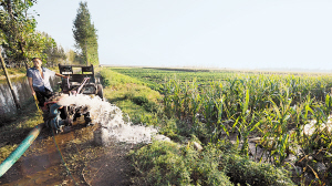 唐河县桐寨铺镇周庄村农民正在给玉米地浇水