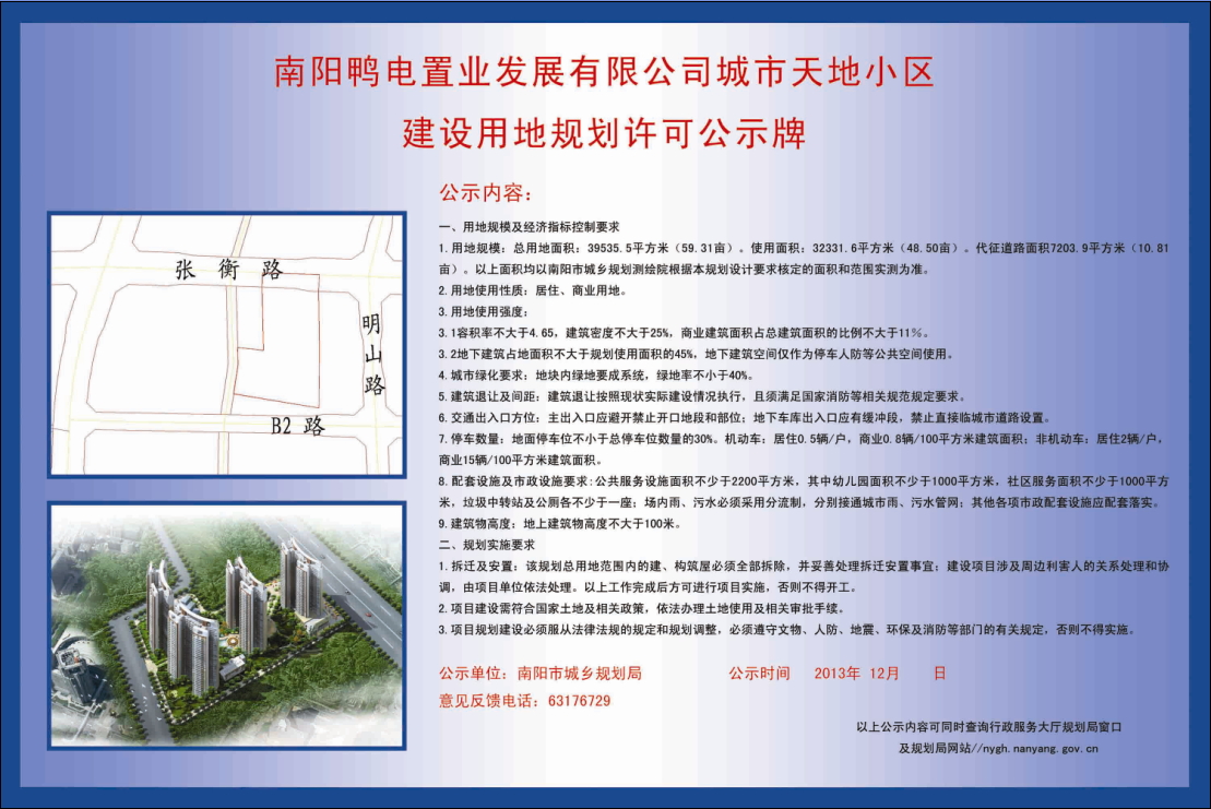[摘要]南阳鸭电置业发展有限公司城市天地小区建设用地规划许可公示牌