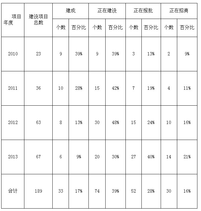(二)项目逐年递增,进展不平衡。按年度统计,数量逐年增加。2010年已建成项目9个,占年度任务39%;正在建设项目9个,占年度任务39%;正在报批建设项目3个,占年度任务13%;正在招商建设项目2个,占年度任务9%。2011年已建成项目10个,占年度任务28%,正在建设项目15个,占年度任务42%;正在报批建设项目7个,占年度任务19%;正在招商建设项目4个,占年度任务11%。2012年已建成项目8个,占年度任务13 %;正在建设项目30个,占年度任务48%;正在报批建设项目15个,占年度任务24%;正在招商建设项目10个,占年度任务16%。2013年已建成项目6个,占年度任务9%;正在建设项目20个,占年度任务30%,正在报批建设项目27个,占年度任务40%;正在招商建设项目14个,占年度任务21%。责任单位之间进展不平衡。如县教体局承担建设项目11个,已建成项目6个,正在建设项目5个;县房管中心承担建设项目7个,已建成项目4个,正在建设项目3个。乡镇之间进展不平衡。杨集乡承担建设项目7个,已建成项目1个,正在建设项目2个,正在报批建设项目4个;独树镇承担2个建设项目正在报批手续。