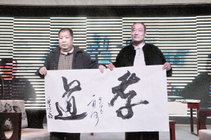 二月河与邢清鑫现场泼墨共写“孝道”(二月河写“孝”,邢清鑫写“道”)
