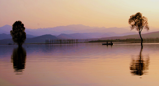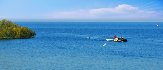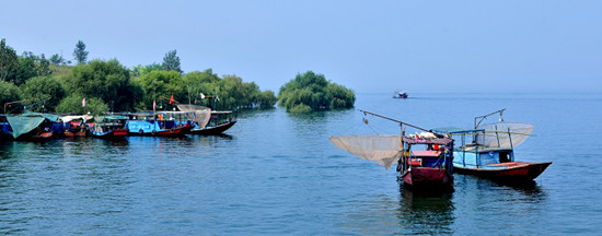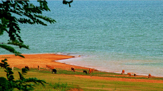 各位游客,我们现在看到的这个岛叫毛坪岛。岛上杂树葱郁,绿草铺地,好似一条独卧水上的巨型鲤鱼,人们由此称其为鲤鱼卧沙滩。
