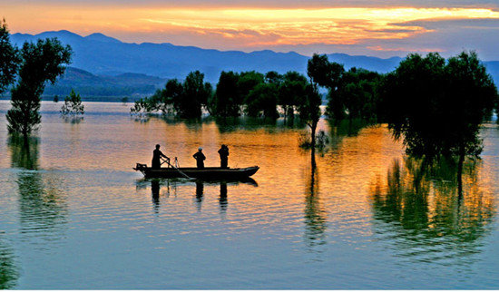 穿过太白峡,我们便进入了水流轻柔舒缓的出口峡,这就是雁口峡。这里两岸山势不高,平坦舒缓,相对的两座山极像雁的嘴巴,所以得名雁口峡。山上绿叶茂盛、青翠欲滴,山水相映,水舟相连,山影、船影和人影一齐倒映水中,多像一幅古色古香的水墨山水画!这边峭壁上有几个山洞,裸露出黑色的山体,其实那是一种实用价值很高的矿藏---石煤。据说这里石煤储量相当丰富,价值不菲。但为了给京津人民送上干净放心的水,淅川人民舍小利顾大局,封矿育林,确保源头绿水长流。
