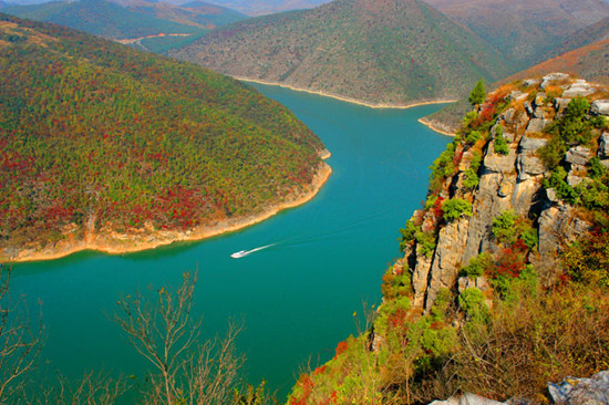 各位朋友,我们已进入了丹江小三峡。这是第一峡---云岭峡。云岭峡为丹江小三峡的入口峡。因为过去两岸山上松林茂密,郁郁葱葱,峰峦对峙,遮天蔽日,远远望去云遮雾绕而得名。只可惜,这里的树木早在“大炼钢铁”时几乎被砍伐殆尽了。云岭峡峰回水转,真应了那句“山重水复疑无路,柳暗花明又一村”的诗句。若赶上深秋时节来,漫山遍野,层林尽染,不是香山,胜似香山,实乃此地一大胜景。