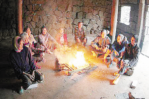 冬天的火塘是家里最温暖的地方。男人外出回来,直奔火塘,搓着双手,映着火光,驱散一身的寒气;女人收拾完了厨房和牲口,坐在火塘边纳鞋底做棉衣;小孩子放学回家,嘴里的“冷死了”还没说完,人就跑到了火塘边,张开冻得冰凉的双手贪婪地烤火。吃过晚饭,一家人围坐在火塘边,说家事,谈亲戚,论乡民,四邻八乡,五湖四海,天南海北地瞎扯着,手里还在剥着油桐籽,或者修理着用坏了的农具家什。有时候,孩子还会缠着大人给讲故事,大人便让孩子给背首唐诗作回报。等到时候差不多了,身上暖透了,便睡觉去。没烧完的疙瘩,埋在温热的灰里,第二天清早起来,还带着火星子,抓一把干草捂上,吹几口,就重新燃烧起来了。